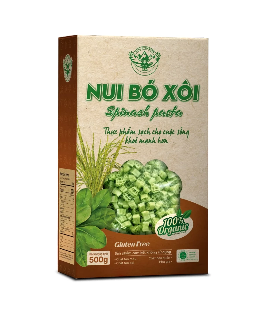 - Nui được làm từ cải Bó Xôi canh tác Hữu Cơ, Vổ sung Canxi, Vitamin, chất xơ và các chất dinh dưỡng cần thiết cho cơ thể.